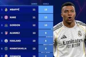 1、姆巴佩(皇马)15球